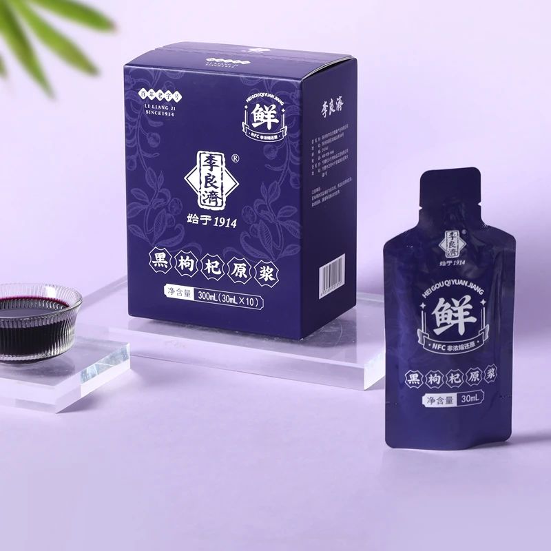 采用現(xiàn)摘果鮮榨,保留更多營養(yǎng)物質(zhì),30ml李良濟(jì)黑枸杞原漿約110-170顆黑果枸杞。